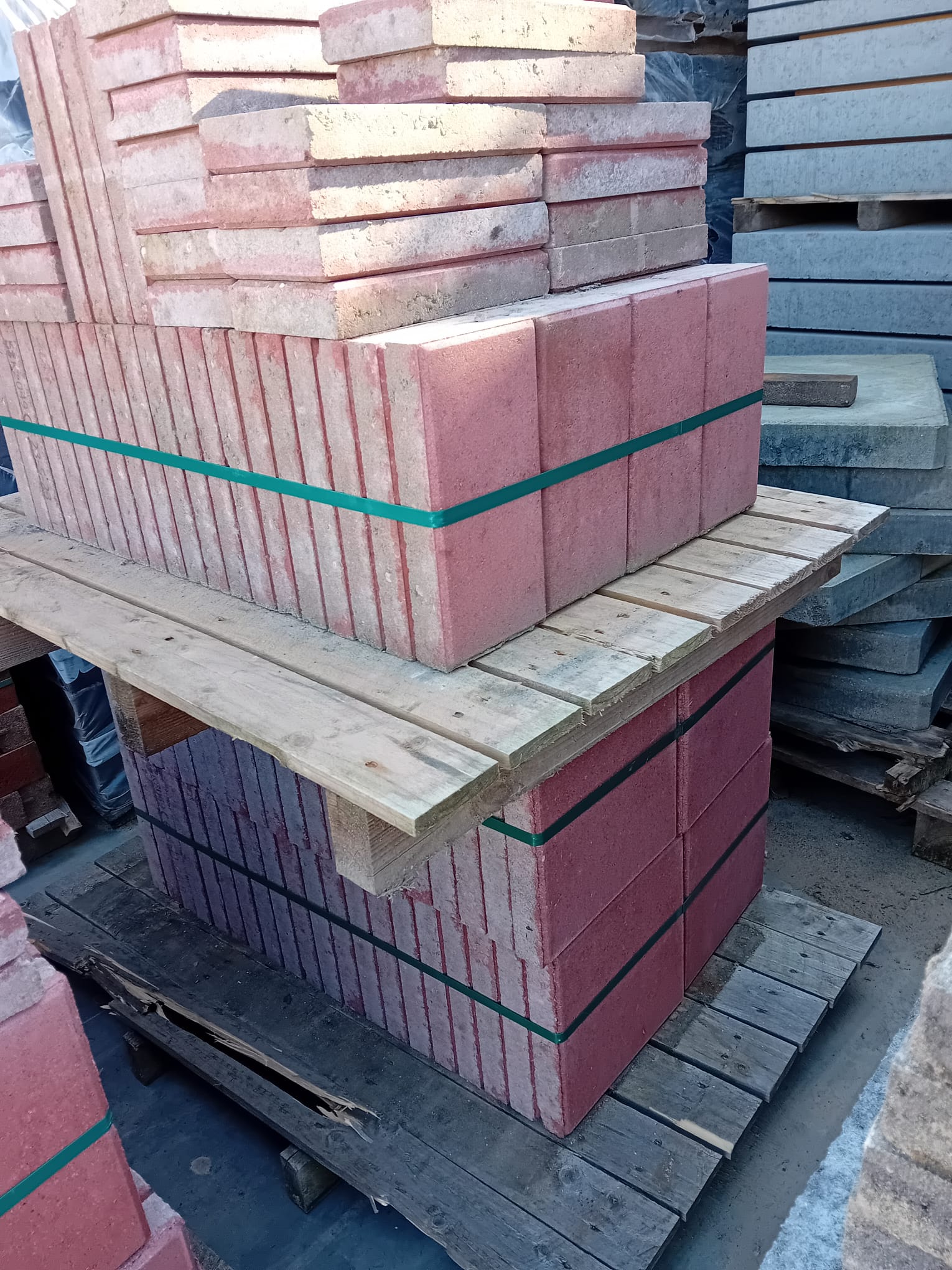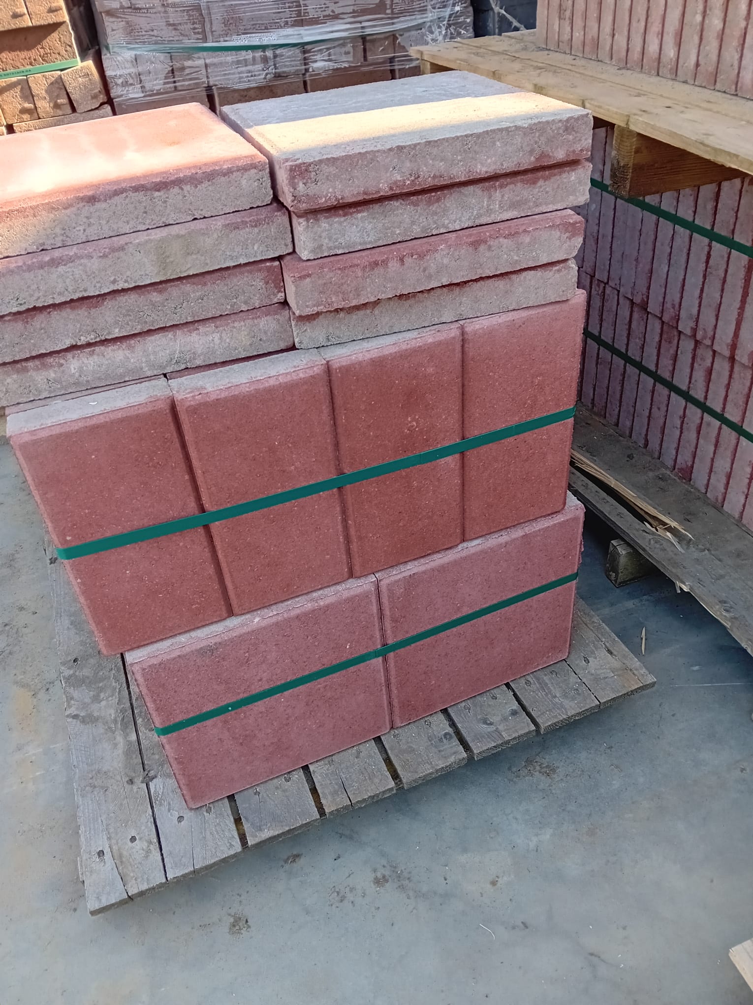 Deze rode stoeptegel is snel te leggen en geschikt voor terras of trottoir. Deze partij bevat hele en halve tegels.